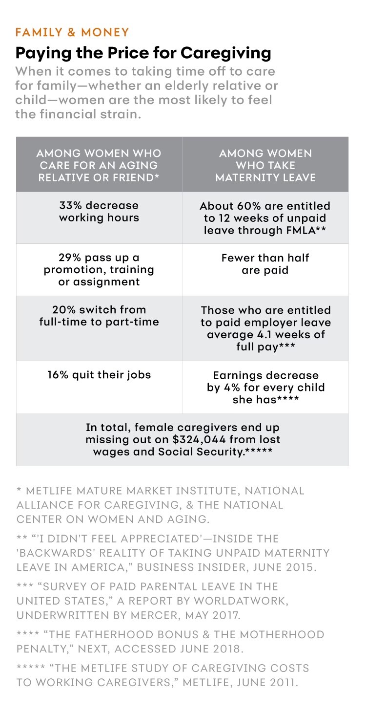 This chart is under the category "Family and Money" and the title is "Paying the price for Caregving." The introduction is "When it comes to taking time off to care for family—whether an elderly relative or child—women are the most likely to feel the financial strain. For women who care for an aging relative or friend, there are four statistics listed: a 33 percent decrease in working hours; 29 percent pass up a promotion, training or assignment; 20 percent switch from full-time to part-time; 16 percent quit their jobs. For women who take materinity leave, there are four statistics listed: about 60 percent are entitled to 12 weeks of unpaid leave through FMLA; fewer than half of those are paid; those who are entitled to paid employer leave average 4.1 weeks of full pay; earnings decrease by 4 percent for every child she has. There is one statistic for both groups: In total, female caregivers end up missing out on $324,044 from lost wages and Social Security.