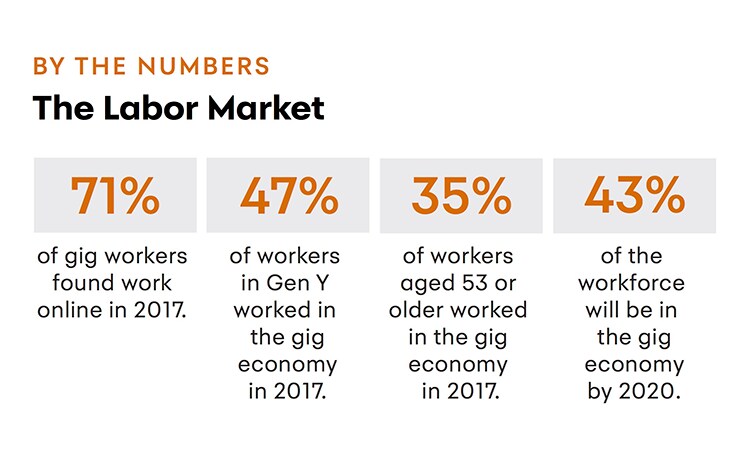 This is a chart in the category "By the Numbers" and the title is "The Labor Market." There are four statistics. 71 percent of gig workers found work online in 2017. 47 percent of workers in Gen Y worked in the gig economy in 2017. 35 percent of workers aged 53 or older worked in the gig economy in 2017. 43 percent of the workforce will be in the gig economy by 2020.