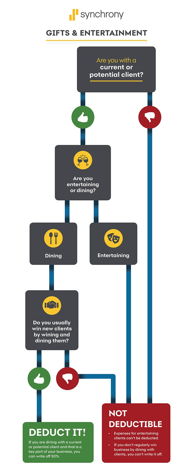 This decision tree is titled "Gifts & Entertainment." Are you with a potential client or a current client? Are you dining or entertaining? If you are dining with a current or potential client and that is a key part of your business, you can write of 50%. Expenses for entertaining clients can’t be deducted, and if you don’t regularly win business by dining with clients, you can’t write it off.