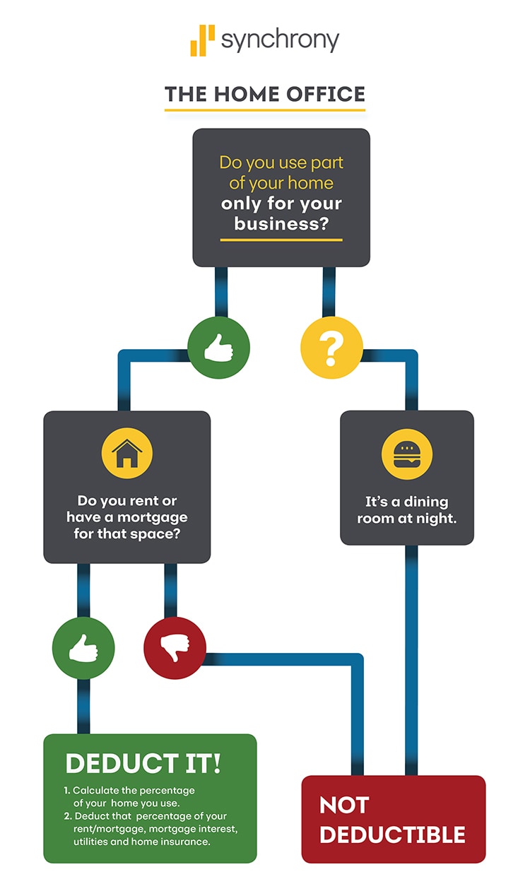 This decision tree is titled "Business Travel Expenses." Do you use part of your home only for your business? If yes, do you rent or have a mortgage for that space? If yes, deduct It! Step one is to calculate the percentage of your home you use. Step two is to deduct that percentage of your rent/mortgage, mortgage interest, utilities and home insurance. If you don't use the room only for business, such as if it’s a dining room at night, it's not deductible.