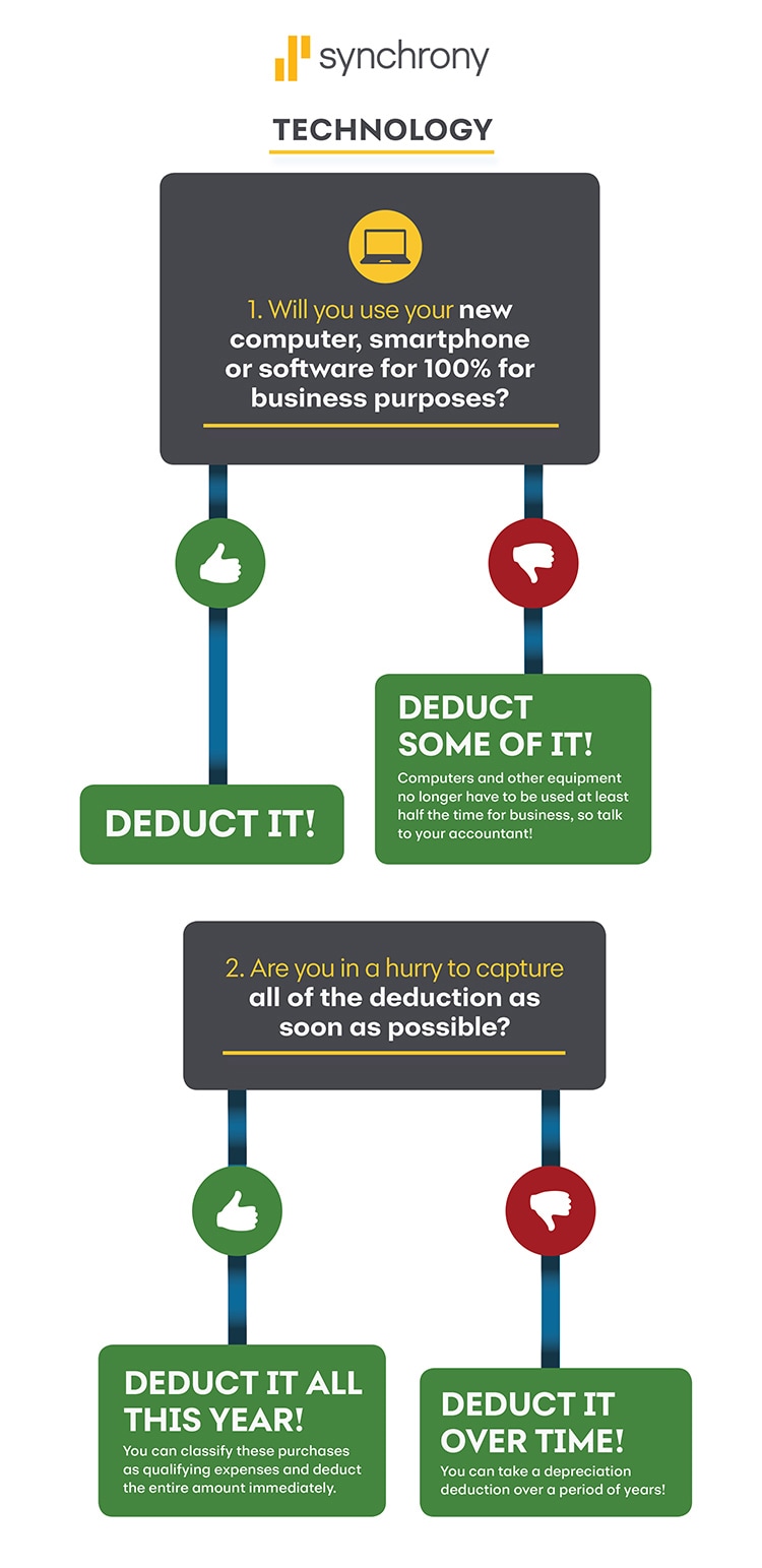 This decision tree is titled "Technology." Will you use your new computer, smartphone or software for 100% for business purposes? If so, you can deduct it. Or, if you are not, you can still deduct Some of It! Computers and other equipment no longer have to be used at least half the time for business, so talk to your accountant! Are you in a hurry to capture all of the deduction as soon as possible? You can classify these purchases as qualifying expenses and deduct the entire amount immediately, or you can take a depreciation deduction over a period of years.