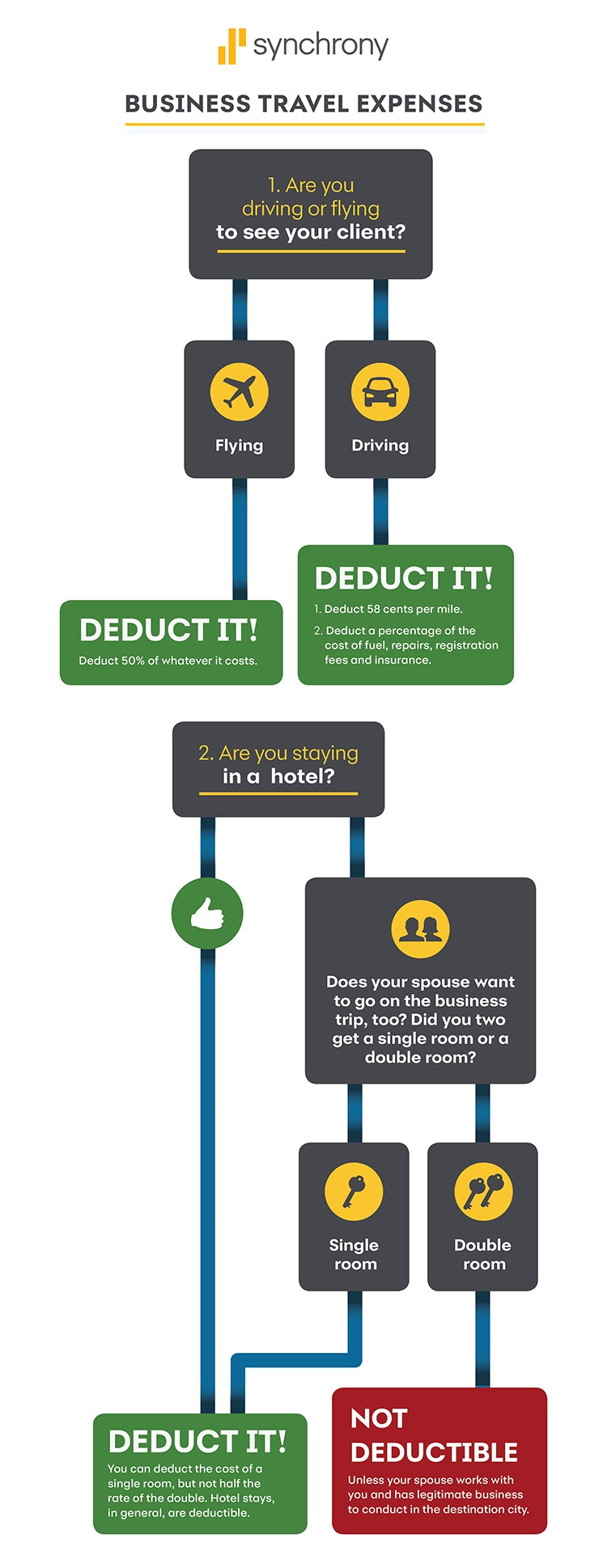 This decision tree is titled "Business Travel Expenses." There are two parts. Part one is "Are you driving or flying to see your client?" If you are flying, you can deduct 50% of whatever it costs. If you are driving, you can deduct 58 cents per mile, and a percentage of the cost of fuel, repairs, registration fees and insurance. Part two is "Are you staying in a hotel?" You can deduct the cost of a single room, but not half the rate of the double. Hotel stays, in general, are deductible. So if your wife is traveling with you, you can't deduct a double room unless your spouse works with you and has legitimate business to conduct in the destination city.