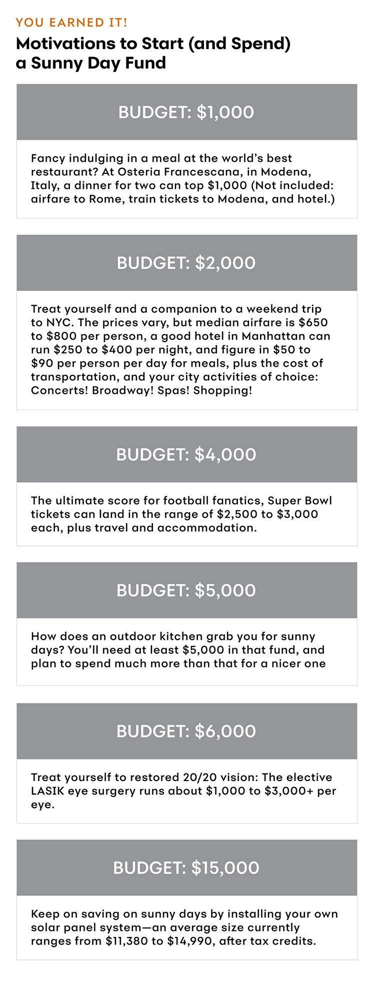 This chart is in the category "You Earned It!" and is titled "Motivations to Start (and Spend) a Sunny Day Fund." If your budget is $1,000: Fancy indulging in a meal at the world’s best restaurant? At Osteria Francescana, in Modena, Italy, a dinner for two can top $1,000. (Not included: airfare to Rome, train tickets to Modena, and hotel.) If your budget is $2,000: Treat yourself and a companion to a weekend trip to NYC. The prices vary, but median airfare is $650 to $800 per person, a good hotel in Manhattan can run $250 to $400 per night, and figure in $50 to $90 per person per day for meals, plus the cost of transportation and your city activities of choice: Concerts! Broadway! Spas! Shopping! If your budget is $4,000: The ultimate score for football fanatics, Super Bowl tickets can land in the range of $2,500 to $3,000 each, plus travel and accommodations. If your budget is $5,000: How does an outdoor kitchen grab you for sunny days? You’ll need at least $5,000 in that fund, and plan to spend more for a nicer one. If you budget is $6,000: Treat yourself to restored 20/20 vision: The elective LASIK eye surgery runs about $1,000 to $3,000+ per eye. If your budget is $15,000: Keep on saving on sunny days by installing your own solar panel system—an average size currently ranges from $11,380 to $14,990, after tax credits.